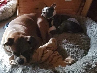Buba the Boxer and Blue the Boston (previously Hewie). Blue was a breeder release and when he came to us he couldn't walk on a leash and he was absolutely terrified. He has all the confidence in the world now as he has taken the lead from our other dogs. The trick is to stay with it and have patience. Easier said then done sometimes.